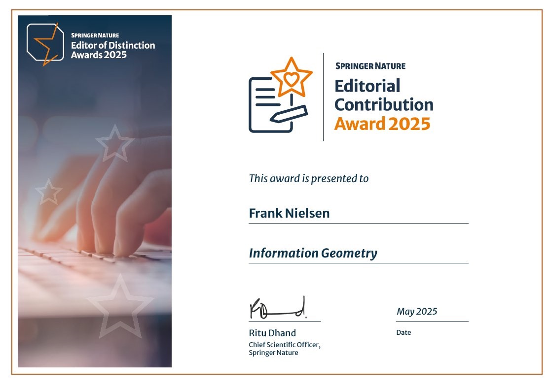 Frank Nielsen (prof. dr hab.) received his MSc. in parallel and distributed computing with first class honor from Ecole Normale Superieure of Lyon (France). He prepared his PhD on computational geometry (1996) at INRIA Sophia-Antipolis (France), and was awarded the PhD and HDR diploma from University of Cote d’Azur (France). He is a Senior Researcher of Sony Computer Science Laboratories Inc. (Sony CSL, Tokyo). He was promoted Fellow of Sony CSL for his continuous and pioneering contribution to geometric modeling and algorithms in visual computing and information sciences. The former efforts yielding original panoramic video and interactive video-based multimedia applications which were successfully commercialized in Sony's Fourthview product line-up, and the latter involved outstanding contributions to a geometric theory of information and statistical models with broad applications ranging from signal processing to machine learning. He currently conducts research on Structures, Dynamics, and Geometric Computing for AI and Information Theory. He taught algorithmics at Ecole des Mines (ISIA, France), C++/Linux at Polytech Nice (ESSI, France), Ecole Polytechnique (Palaiseau, France) visual computing (Charles River Media textbook, 2005), Java (Springer, 2009), and high-performance computing for data science (Springer UTICS textbook, 2016), and currently serves the following journals: Information Geometry (Springer), Transactions on Information Theory (IEEE), and Entropy (MDPI). Frank Nielsen co-organizes with Frederic Barbaresco the biannual conference Geometric Science of Information. |